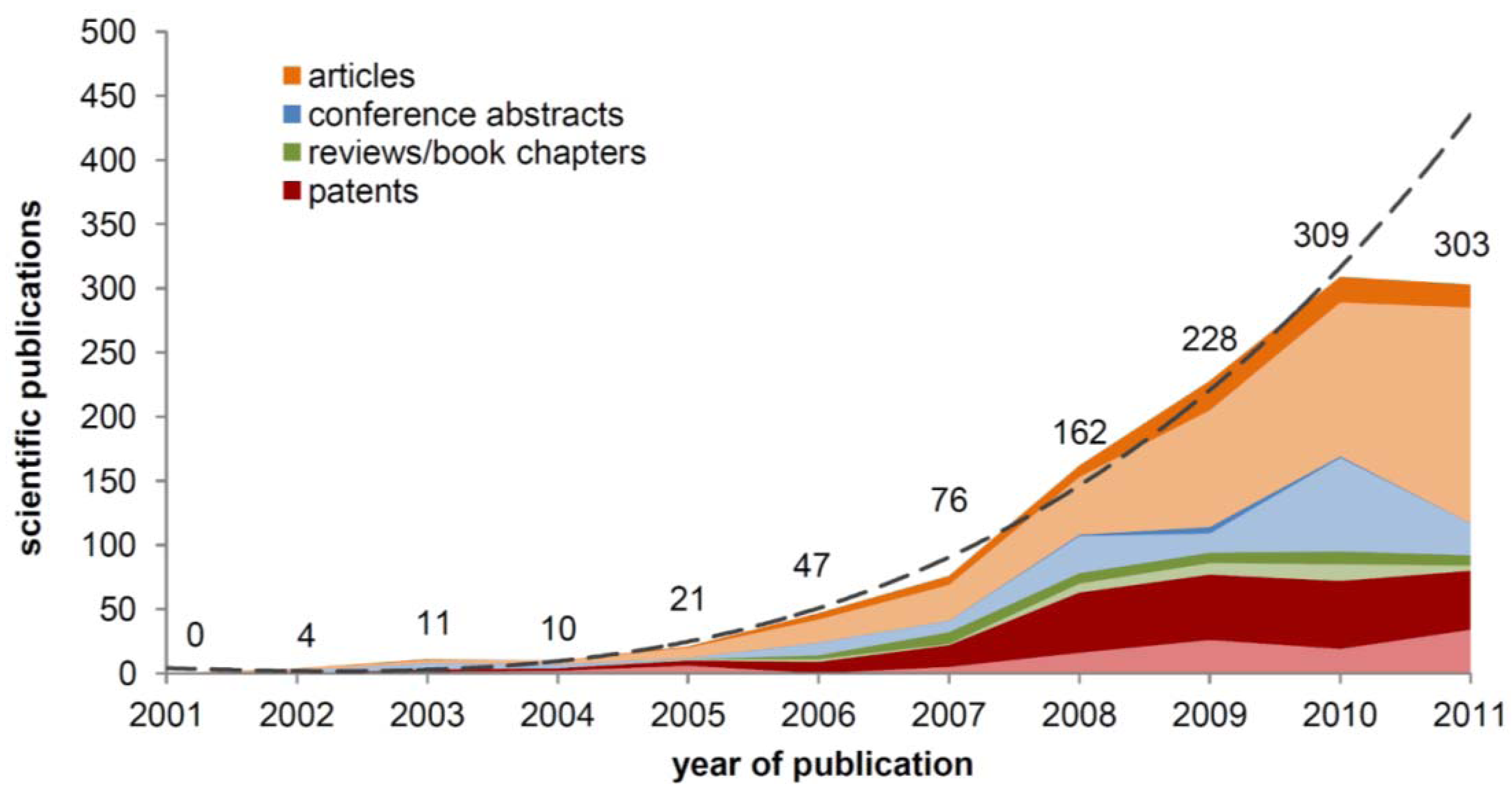 Publications in the years 2001 to 2011, found in the SciFinder® database for the term “cellulose ionic liquids”, separated by document type (bright/dark areas correspond to articles published in English/other languages). Dotted lines represent a prognoses based on the number of total publications (excluding data for 2011).