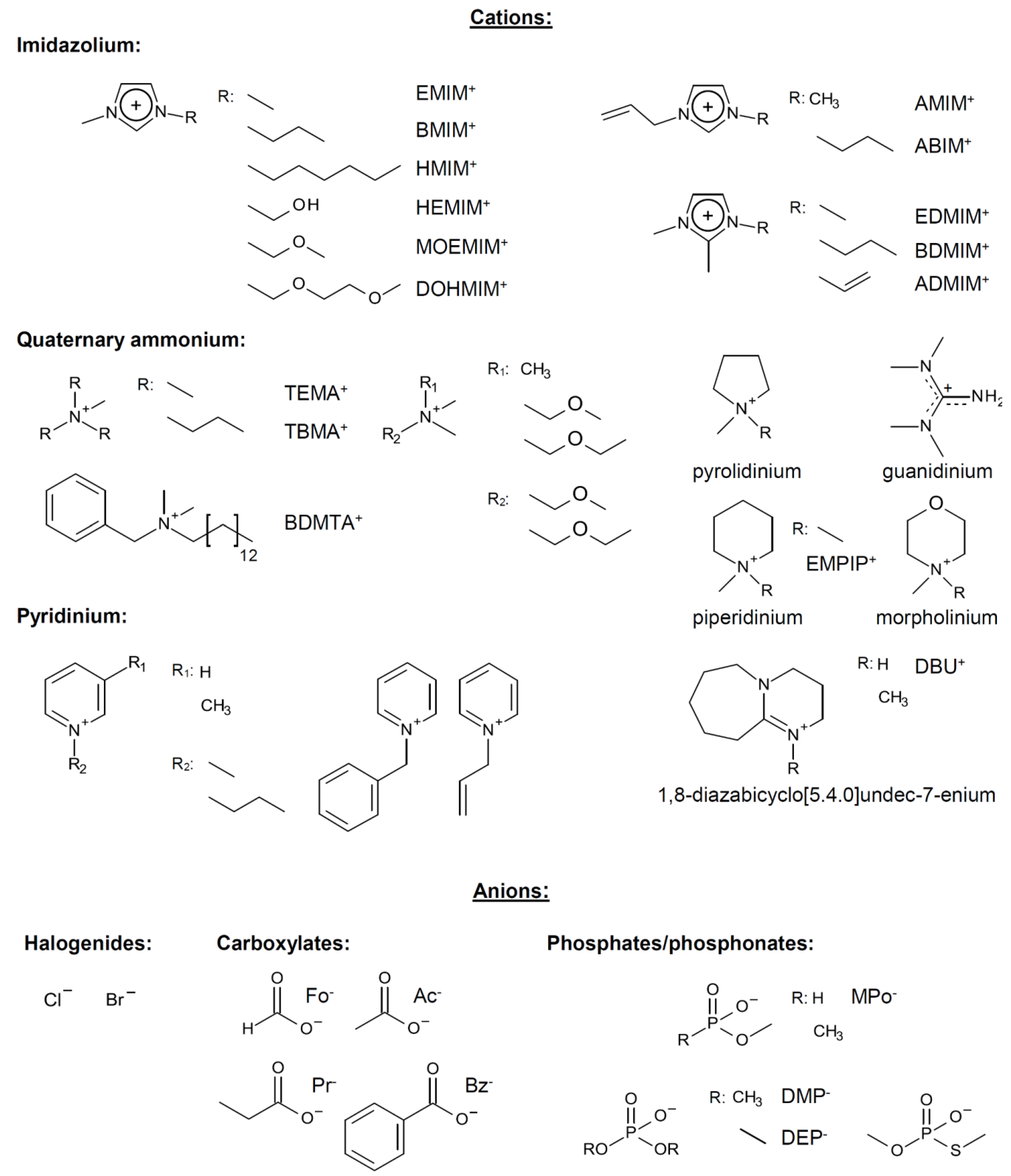 Molecular structures and abbreviations of anions and cations of typical ionic liquids and low-melting organic salts, reported for dissolution of cellulose.