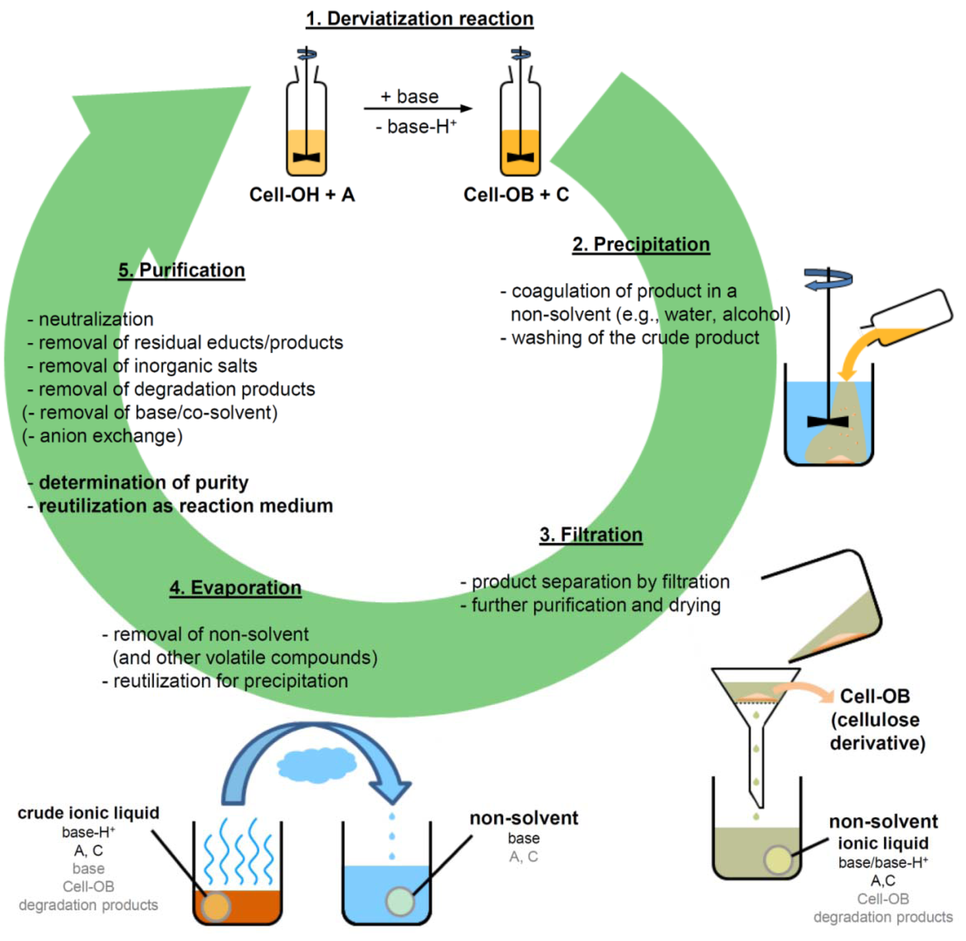 ILs have been exploited for shaping of cellulose into fibers, films, sponges, beads, and other cellulosic objects [5,6,7,8,9]. In addition, they are studied intensively for “biorefinery applications”, which includes fractionation of lignocellulosic biomass, IL-pretreatment of cellulose for improving enzymatic hydrolysis, and conversion of cellulose dissolved in ILs into mono/disaccharides, platform chemicals, and biofuels. These complex aspects have already been reviewed separately and are consequently not part of the present work [10,11,12].