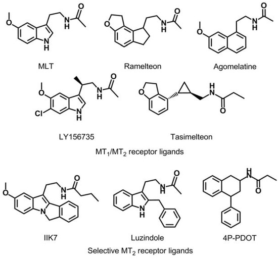 Ever since the idea arose that MLT might promote sleep and resynchronize circadian rhythms, many research groups have centered their efforts on obtaining new melatonin receptor ligands [4,6,8,9,10,11]. As can be observed in Figure 1, several series of MT2 ligands have been described as a competitive agonists or antagonists with varying degrees of selectivity (IIK7 is a selective MT2 receptor agonist and luzindole and 4P-PDOT are a selective MT2 receptor antagonists) as well as compounds with affinity for both melatoninergic receptor subtypes (melatonin, ramelteon, agomelatine, LY156735 and tasimelteon) [12,13,14,15].