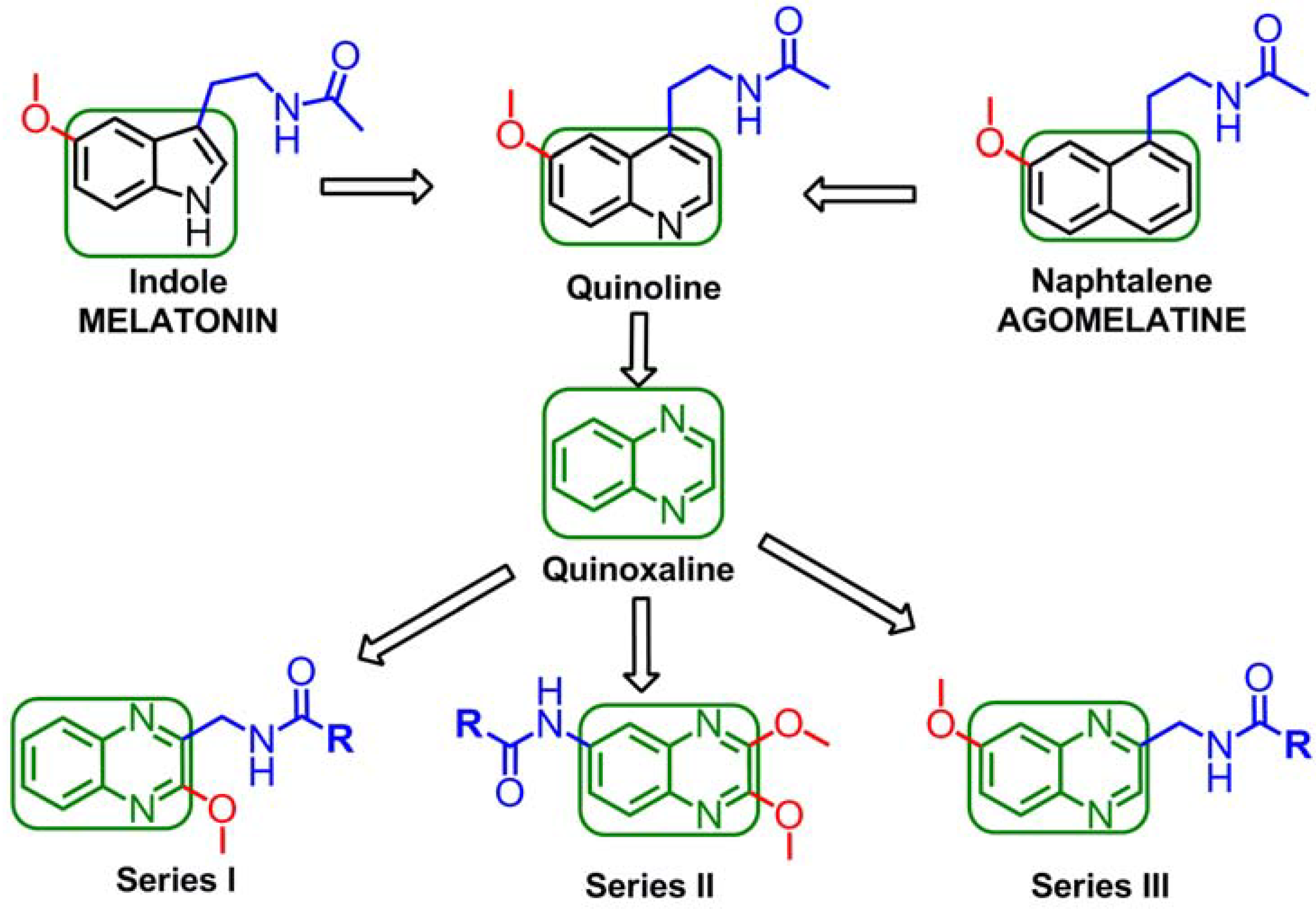 Ever since the idea arose that melatonin might promote sleep and resynchronize circadian rhythms, many research groups have centered their efforts on obtaining new melatonin receptor ligands whose pharmacophores include an aliphatic chain of variable length united to an N-alkylamide and a methoxy group (or a bioisostere), linked to a central ring. Substitution of the indole ring found in melatonin with a naphthalene or quinoline ring leads to compounds of similar affinity. The next step in this structural approximation is to introduce a quinoxaline ring (a bioisostere of the quinoline and naphthalene rings) as the central nucleus of future melatoninergic ligands.