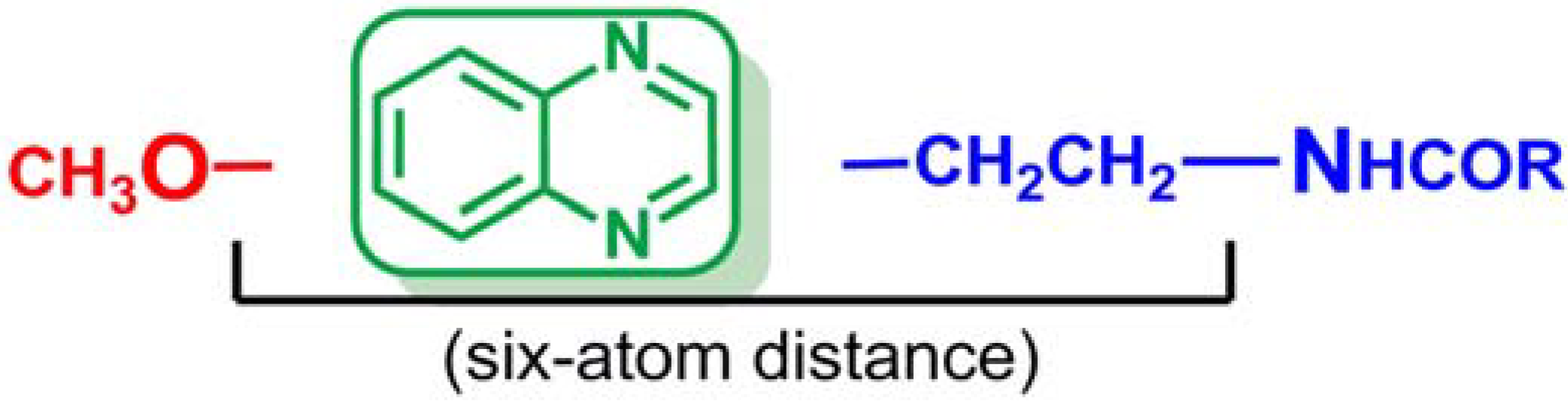 As shown by compounds of Series I and II, shifting the methoxy group from position C6 to C2 of the quinoxaline moiety can modulate the affinity and selectivity of these ligands depending on the distance between the methoxy group and the N-acylamino chain. The comparison of the obtained data for compounds of both series and Series III reveals that switching the methoxy group to position 2 of the quinoxaline ring has a much greater effect on binding affinity to the MT2 receptor subtype than it does on affinity to MT1 receptor, displaying a significant selectivity for MT2 receptor in Series II, where the relative spatial distance (six-atoms) between the two key pharmacophoric elements is also the optimal.