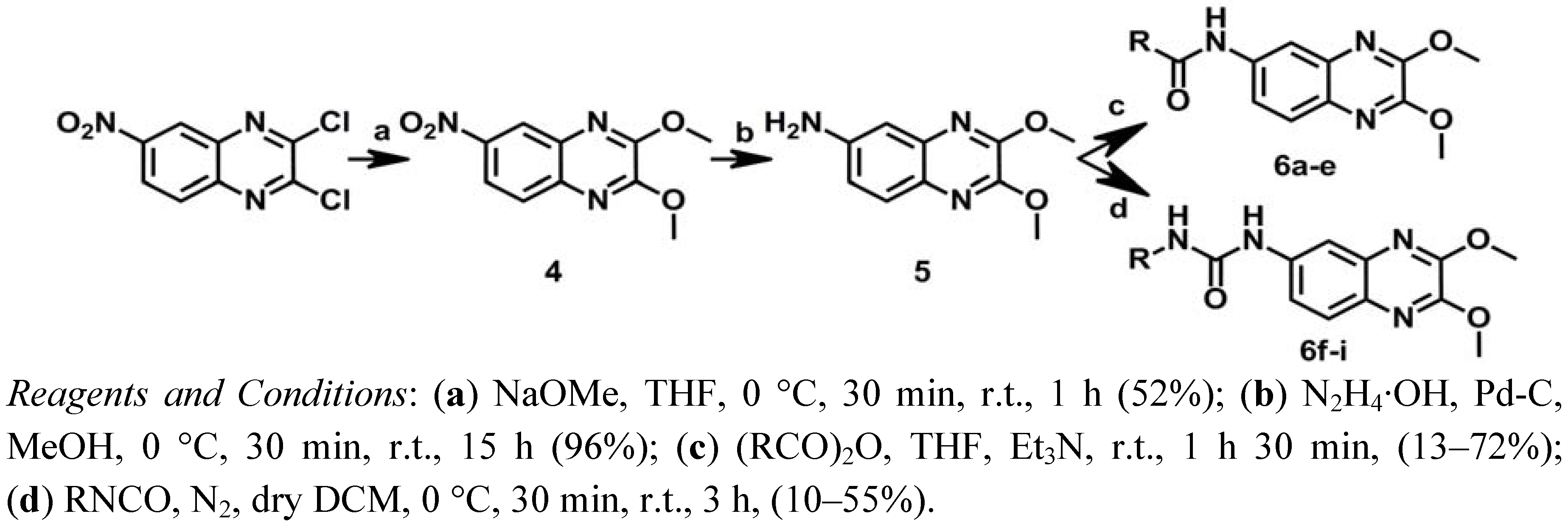 With the aim of obtaining the compounds of series II, a new synthetic route was designed, as shown in Scheme 2. 2,3-Dichloro-6-nitroquinoxaline was first treated with sodium methoxide in THF to give 4 [16]. Subsequently, compound 5 was obtained through the reduction of the nitrile group of 4with hydrazinium hydroxide and palladium on carbon [46]. Finally, N-acylation of compound 5 using a suitable anhydride and triethylamine in THF yielded the corresponding amide analogs 6a–e [47], while treatment of 5 with different isocyanates in dichloromethane (DCM) afforded the urea analogs 6f–i [45].
