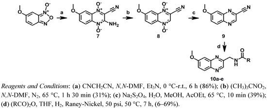 3.1.13. General Procedure for Synthesis of N-[(7-Methoxyquinoxalin-2-yl)methyl]alkylamides 10a–e