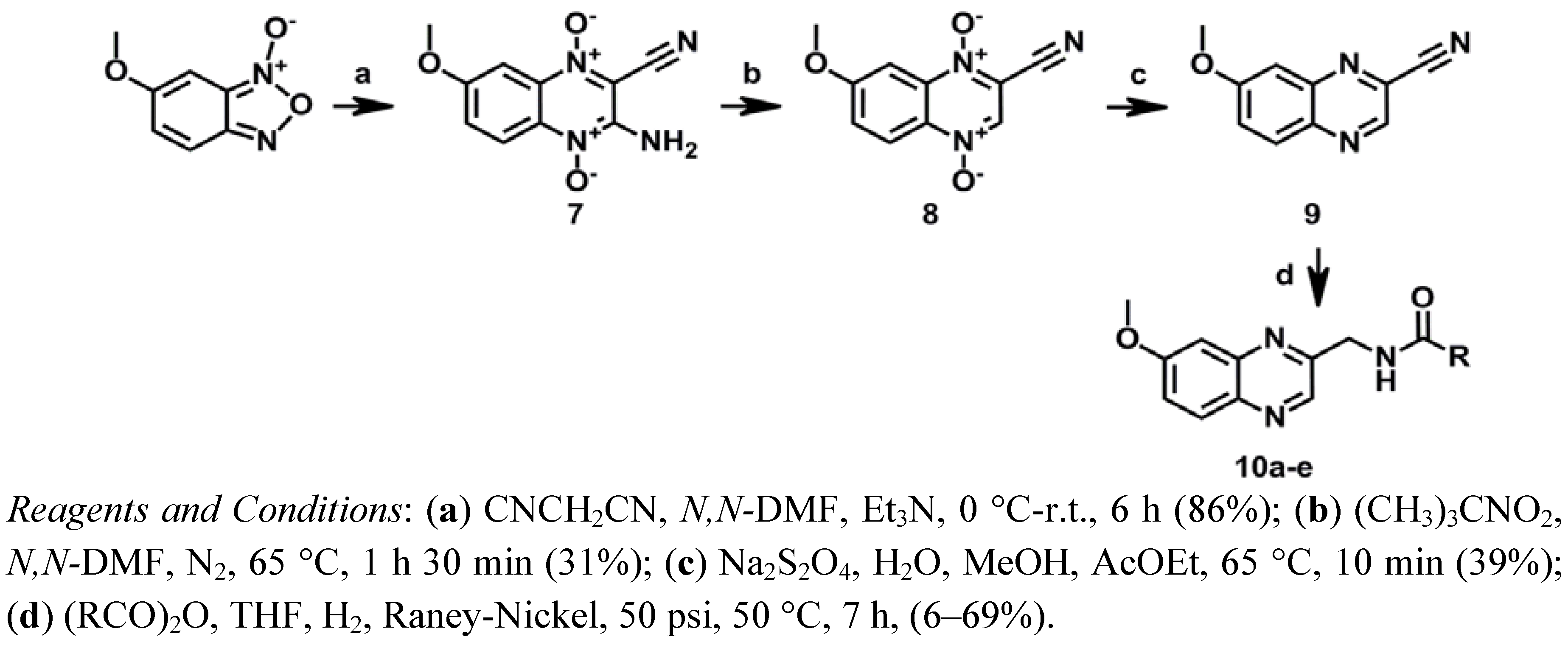 Compounds 10a–e of series III were synthesized as depicted in Scheme 3. A modified Beirut reaction was adopted for the preparation of 7 by condensation of 6-methoxybenzofuroxane and malononitrile.