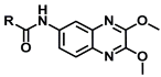 N-(2,3-Dimethoxyquinoxalin-6-yl)acetamide (6a). Yield: 13%. IR (cm−1): 3276, 3116, 2943, 1664. 1H-NMR (DMSO-d6) δ: 10.19 (s, 1H, NH); 8.21 (d, 1H, H5, J5-7 = 2.2 Hz); 7.67 (d, 1H, H8, J8-7 = 8.8 Hz); 7.57 (dd, 1H, H7, J7-8 = 8.9 Hz, J7-5 = 2.2 Hz); 4.03 (s, 3H, OCH3-C2); 4.01 (s, 3H, OCH3-C3); 2.10 (s, 3H, CH3) ppm. Anal. Calcd for C12H13N3O3 · 1/2 H2O: C: 56.25%; H: 5.47%; N: 16.41%; Found: C: 56.23%; H: 5.42%; N: 16.04%. M.p.: 290 °C.