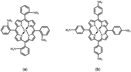 Structure of the porphyrin systems: (a) 5,10,15,20-tetrakis-(2-aminophenyl) porphyrin-cobalt(II), [Co(II)(T(o-NH2)PP)] and (b) 5,10,15,20-tetrakis-(4-aminophenyl) porphyrin-cobalt(II), [Co(II)(T(p-NH2)PP)].