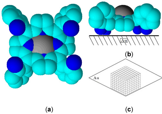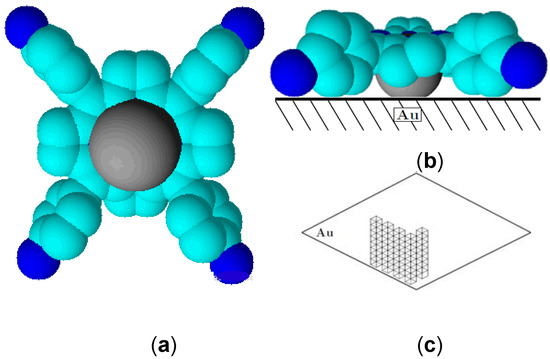 Space-filling models showing top view (a) and side view (b) of the Co(II)(T(p-NH2)PP) adsorbed on the gold electrode. Also shown is the formation of the porphyrin multilayer (c).