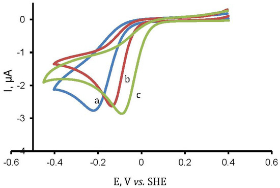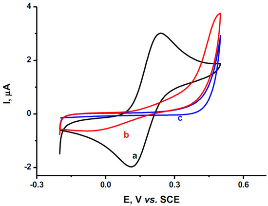 Cyclic voltammograms recorded in a 1 mM potassium ferrocyanide solution with phosphate buffer on a bare gold and the two modified gold surfaces are shown in Figure 6. The voltammogram of the bare gold electrode clearly shows the oxidation and reduction peaks of the ferri/ferrocyanide couple at a potential of 0.23 and 0.12 V vs. SCE (curve a) according to the following reaction [46].