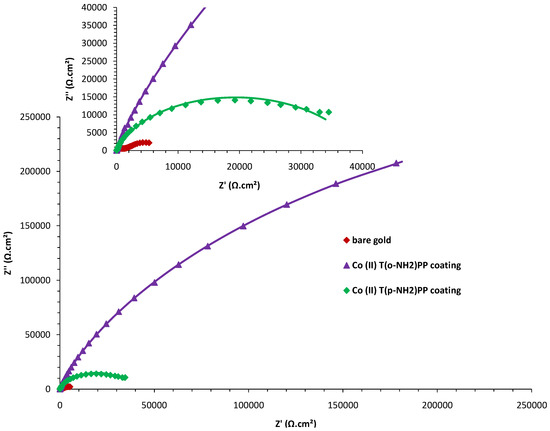 They exhibit a characteristic semicircle at high frequencies and a straight line at low frequencies, corresponding respectively to kinetic and diffusion processes at the gold electrode. In case of the Co(II)(T(o-NH2)PP) modified sample, only the semicircle is seen, which indicates a decrease in diffusion of compounds through the layer because of a well-formed porphyrin film [48]. The slightly depressed nature of the semicircles in the Nyquist plots, even for the bare gold electrode, indicates so-called impedance dispersion. The latter can be explained by a number of factors such as the roughness of the electrode surface, varying thickness of the film, non-ideal behavior of the coating and non-uniform distribution of the current density of the surface [48,49].