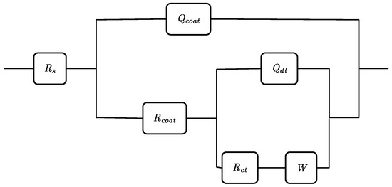 To fit the EIS data, the spectra were modeled using an equivalent electric circuit using mixed kinetic and diffusion control, taking into account the number of time constants deduced from the phase plot. Figure 8 shows an electric circuit with two time constants where Rs is the resistance of the electrolyte, Rcoat the pore resistance of the film and Qcoat the constant phase element representing the capacitance due to the coating barrier. In parallel with Rcoat, we have Qdl the constant phase element representing the double layer, Rct the electron-transfer resistance representing the most appropriate parameter to monitor the protective properties of the film and W the Warburg impedance [50].