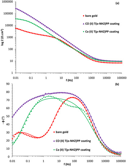 Comparing the impedance vs. frequency plots (Figure 9a), one can conclude that the impedance points for the treated surfaces are higher at each frequency compared to the bare gold surface. The plot for the bare gold surface demonstrates a plateau, which implies easy electron transfer. The porphyrin modified gold electrodes, on the other hand, show a straight line without independent-frequency plateau, which means the electrolyte can penetrate the coating, but no electron transfer process takes place at the gold/coating interface [52]. Grandle et al. [53] observed that the maximum impedance at low frequency, Zmax, is the most useful and reliable parameter to evaluate coatings. Based on this, we can conclude that the Co(II)(T(o-NH2)PP) provides the best protective layer.