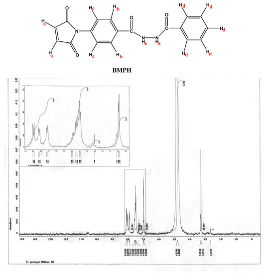 1H-NMR spectrum of BMPH (Figure 2) (DMSO): δHe = 7.0 ppm. (2H, -NH-); δHd = 7.5–7.6 ppm (5H, aromatic protons); δHc = 7.9 ppm (2H, o-H); δHb = 8.0 ppm (2H, m-H), δHa = 8.1 ppm (2H, H-C=C-H). MS m/z: 335 (M+).
