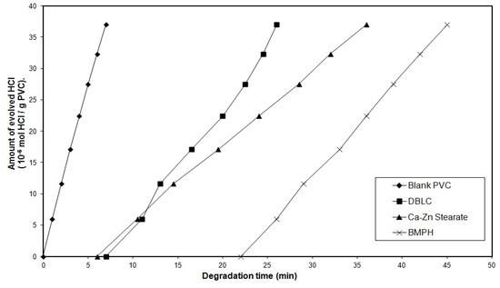 Results of the dehydrochlorination of rigid PVC thermally degraded at 180 °C in air, in the presence of the investigated stabilizer are shown both in Figure 3 and Table 1. The results of the non-stabilized blank PVC as well as those of the samples stabilized by DBLC and Ca–Zn stearate used as reference stabilizers are also given for comparison. The results reveal that BMPH exhibits a greater stabilizing efficiency than those of the two reference stabilizers, which is shown by the longer thermal stability value (Ts) during which no detectable amounts of hydrogen chloride gas are liberated (Table 1). The thermal stability value of BMPH is almost three or four times higher than the values obtained for the reference stabilizers.