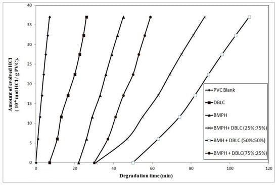 It was of interest to study the effect on the efficiency of stabilization of mixing BMPH stabilizer with reference stabilizers. Mixing was done in the ranges of 0–100% of BMPH relative to DBLC or Ca-Zn stearate reference stabilizers. The overall mixed stabilizers concentration was kept always constant at 2 mass % of PVC and the results represent the average of three comparable experiments for each stabilizer mixture. The results of the dehydrochlorination of thermally degraded rigid PVC at 180 °C, in air, in the presence of each combination are illustrated in Figure 4 and Figure 5. The thermal stability values of such combinations are listed in Table 1. The results reveal the existence of a true synergistic effect resulting from the combination of BMPH stabilizer with any of the two reference stabilizers.