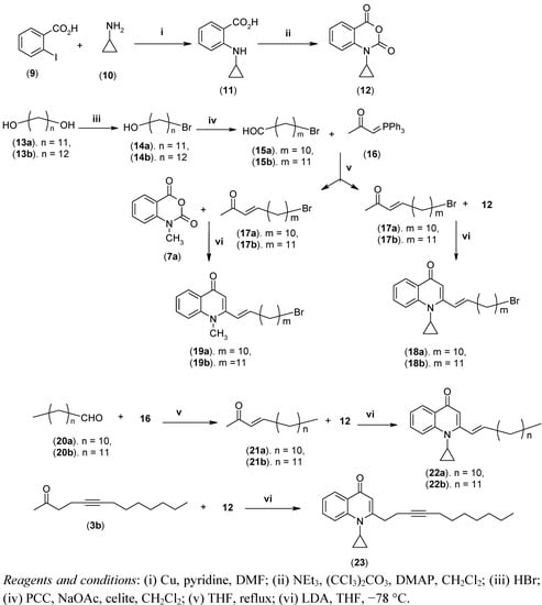 To further assess the biological role of the cyclopropyl moiety at N-1 and compare their antimycobacterial properties with our previously reported N-methyl-2-(E)-alkenyl-4(1H)-quinolones, compounds 22a–b were prepared from the commercially available aldehydes 20a–b following the same methods described before []. Similarly, analogue 23 containing cyclopropyl and undecynyl groups at positions 1 and 2, respectively (Scheme 2), was prepared from compounds 3b and 12 in order to examine their impact on biological potency. The identity of the synthetic intermediates and the 4(1H)-quinolone derivatives was confirmed by analysis of 1D and 2D-NMR spectroscopic and LC-ESI-MS data. The compounds 8a–8t, 18a–b, 19a–b, 22a–b and 23 are reported here for the first time.