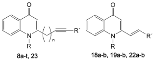 As shown in Scheme 1, our rational design for the synthesis of N-alkyl-2-alkynyl-4(1H)-quinolones was based on the replacement of the double bond with a triple bond, while maintaining the basic quinolone skeleton. The synthetic route targeting compounds 8a–t is given in Scheme 1. The key intermediates, 3a–e and 6a–d, which are essential for the synthesis of our target quinolone derivatives were obtained in two ways. Pd(OAc)2 and PMe3 mediated direct coupling of methyl vinyl ketone (2) and 1-alkynes 1 in acetone afforded 5-alkynyl-2-ones 3a–e []. The 3-alkynyl-2-ones 6a–d, on the other hand, were prepared according to the Xing and O’Doherty procedure [] by treatment of the terminal alkynes 1 with acetaldehyde in the presence of n-BuLi in THF and subsequent oxidation with MnO2. The synthesis of this series of 4(1H)-quinolones was accomplished by the well-known condensation of methyl alkynyl ketones 3a–e and 6a–d with N-alkyl isatoic acid anhydrides 7a–d in presence of LDA in THF at −78 °C.