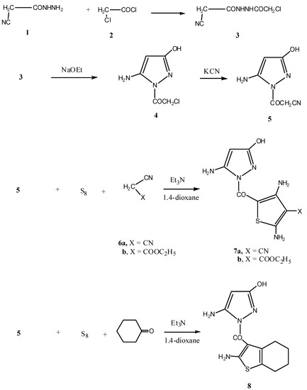 Heterocyclization of N-α-halocarbonyl derivatives using sodium ethoxide has been previously reported [13,14,15,16,17]. Thus, compound 3 readily underwent cyclization when heated in sodium ethoxide solution to give 1-(5-amino-3-hydroxy-1H-pyrazol-1-yl)-2-chloroethanone (4). The IR spectrum of this compound indicated the presence of OH and NH2 groups at 3583–3305 cm−1 and C=O at 1693 cm−1. Furthermore the 1H-NMR spectrum revealed the presence of a singlet δ at 4.51 ppm, a singlet at δ 4.88 ppm, a singlet at δ 6.89, and a singlet at δ 10.36 ppm (D2O exchangeable) corresponding to the CH2, NH2, the pyrazole H-4 and the OH group protons, respectively. Compound 4 was converted to the corresponding N-carbonylacetonitrilopyrazole derivative 5 by nucleophilic substitution of the chlorine atom using potassium cyanide. Subjecting compound 5 to the Gewald thiophene synthesis [18,19,20,21,22] via its reaction with either malononitrile (6a) or ethyl cyanoacetate (6b) and elemental sulfur in presence of triethylamine as basic catalyst afforded the pyrazol-1-yl N-thiophen-5-yl derivatives 7a and 7b, respectively. On the other hand, the reaction of compound 5 with cyclohexanone and elemental sulfur in presence of triethylamine as basic catalyst afforded the (5-amino-3-hydroxy-1H-pyrazol-1-yl)(2-amino-4,5,6,7‑tetrahydrobenzo-[b]thiophen-3-y0,l)methanone derivative 8 (Scheme 1). The analytical and spectroscopic data of compounds 7a,b and 8 are consistent with the proposed structures (see Experimental section). Thus, the 1H-NMR spectrum of compound 8 showed the presence of two multiplets at δ 2.23–2.27 ppm indicating the presence of the four CH2, two singlets at δ 4.49, 4.80 ppm indicating the presence of two NH2 groups, a singlet at δ 6.89 ppm indicating the pyrazole H-4 and a singlet at δ 10.23 ppm corresponding to the OH group. Moreover, the 13C-NMR showed the following signals at δ: 20.0, 23.1, 14.0, and 24.6 (cyclohexane C), 109.3, 113.4, 138.6, 143.8, 144.8, 150.2, and 152.9 (pyrazole, thiophene C), 160.6 (C=O).