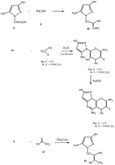 The reaction of compound 5 with benzaldehyde (9) gave the phenylmethylidene derivative 10. The latter showed interesting reactivity towards cyanomethylene reagents, namely malononitrile (6a) and ethyl cyanoacetate (6b) and afforded the pyrazole-1-yl-pyran derivatives 11a and 11b, respectively. The latter products underwent ready cyclization in sodium ethoxide solution to give thedihydropyrazolo[1,5-a]pyrano[2,3-d]pyrimidines 12a and 12b, respectively. On the other hand, heating compound 5 with acetophenone (13) in an oil bath at 120 °C in the presence of ammonium acetate afforded the Knoevenagel condensation product 14 (Scheme 2) [23,24,25,26,27].