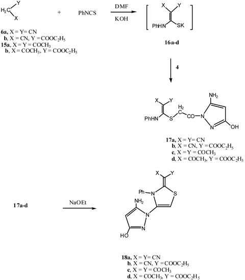 1-(5-Amino-3-hydroxy-1H-pyrazol-1-yl)-2-thio(2-cyano-3-phenylamino-acrylonitril-3-yl)-ethanone (17a), 1-(5-amino-3-hydroxy-1H-pyrazol-1-yl)-2-thio(ethyl 2-cyano-3-phenylaminoacrylat-3-yl)ethanone (17b), 1-(5-amino-3-hydroxy-1H-pyrazol-1-yl)-2-thio(2-acetyl-4-phenylamino-but-3-ene-2-one-4-yl)ethanone (17c) and 1-(5-amino-3-hydroxy-1H-pyrazol-1-yl)-2-thio(ethyl 2-acetyl-3-phenylaminopropenoat-3-yl)ethanone (17d). General procedure: To a solution of either 6a (0.66 g, 0.01 mol) or 6b (1.13 g, 0.01 mol), 6c (1.0 g, 0.01 mol) or 6d (1.30 g, 0.01 mol) in dimethylformamide (30 mL) containing potassium hydroxide (0.56 g, 0.01 mol), phenylisothiocyanate (1.30 g, 0.01 mol) was added. The whole reaction mixture was stirred at room temperature overnight. On the next day compound 4 (1.75 g, 0.01 mol) was added with continuous stirring overnight at room temperature then poured onto ice/water containing few drops of hydrochloric acid (to pH 6). The solid product, formed in each case, was collected by filtration.