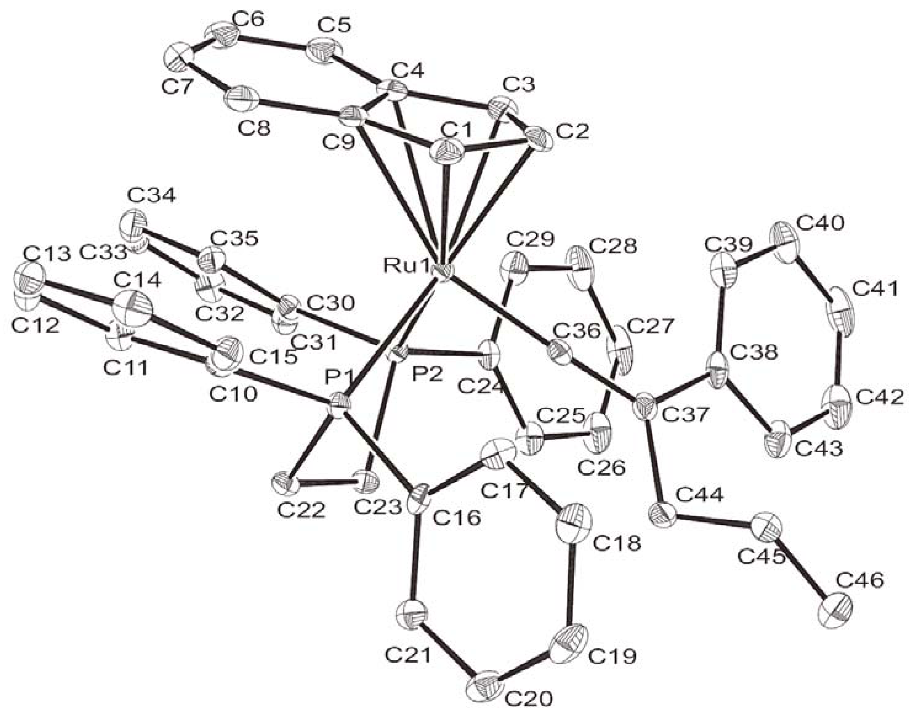 Complex 2a was air-stable at room temperature. Single crystals of 2a suitable for X-ray diffraction analysis were obtained via recrystallization from CH2Cl2/ether. The ORTEP drawing of 2a with thermal ellipsoids is shown at the 30% probability level in Figure 1, with selected bond distances and angles listed in Table 1. The C(37)–C(36)–Ru(1) linkage was basically linear. The C(36)–Ru(1) bond length of 1.841(4) Å indicated a typical metal-carbon bond in the vinylidene complexes [21,22]. Ruthenium vinylidene complexes containing indenyl ligand have been reported [23,24,25,26,27]. The X-ray structure of the vinylidene indenyl-ruthenium complex [Ru{=C=C(CH3)(C6H9)}(η5-C9H7)(PPh3)2]+ with bond length Ru-C(α) 1.838(5) Å [26]. The bond angle of this complex is 176.2(4) also very close linear.