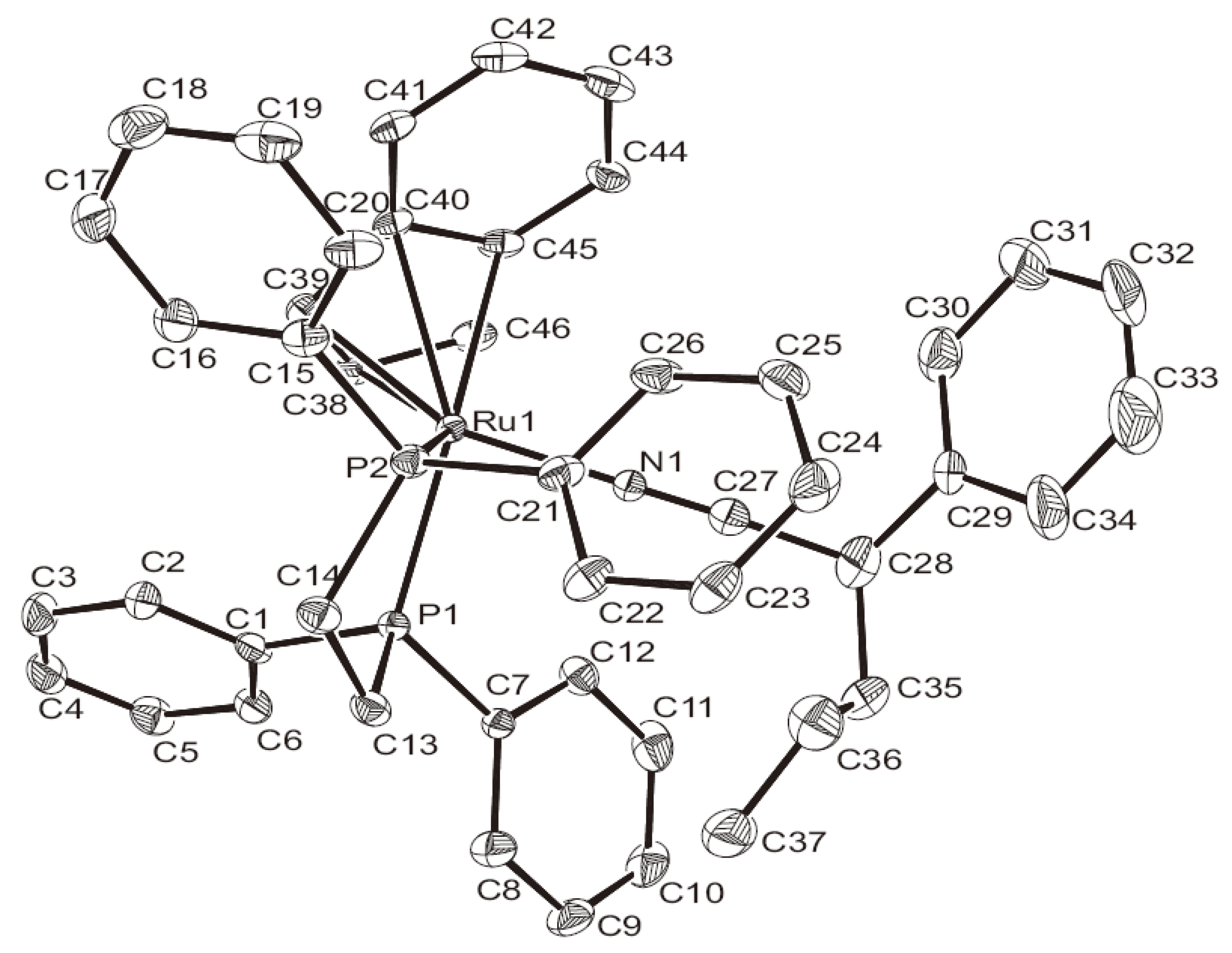 Complex 3a was stable in solution and air, and soluble in polar solvents, such as CH2Cl2, acetone, and THF. Complex 3a was characterized by 1H-, 31P-, 13C-NMR, as well as 2D-NMR spectroscopy. In the 31P{1H}-NMR spectrum of 3a, two doublet resonances at δ 83.4 and 81.4 with a P–P coupling constant of 27.2 Hz indicated the presence of a enantiotopic center in the N-coordinated nitrile ligand. In the 1H-NMR spectrum, a triplet pattern at δ 3.82 with JH-H = 7.15 Hz was assigned to the proton at this enantiotopic center. The parent peak in the HRMS spectrum of 3a clearly indicated that 3a resulted by adding a nitrogen atom to 2a. Slow diffusion of the diethyl ether into a solution of 3a in dichloromethane permitted a collection of suitable single crystals for X-ray diffraction studies (Table 2). An ORTEP diagram of one of the stereoiomers 3a is shown in Figure 2, showing 30% thermal ellipsoids, and selected structural parameters are listed in Table 3. The nitrile ligand was coordinated to the metal center via the nitrogen atom. The bond lengths of Ru(1)–N(1) of 2.031(4) Å and N(1)–C(27) bond length of 1.130(7), respectively, were typical. The N(1)–C(27)–C(28) bond angle of 176.8° was close to 180°. X-ray analysis unequivocally confirmed the molecular structure (Table 3).