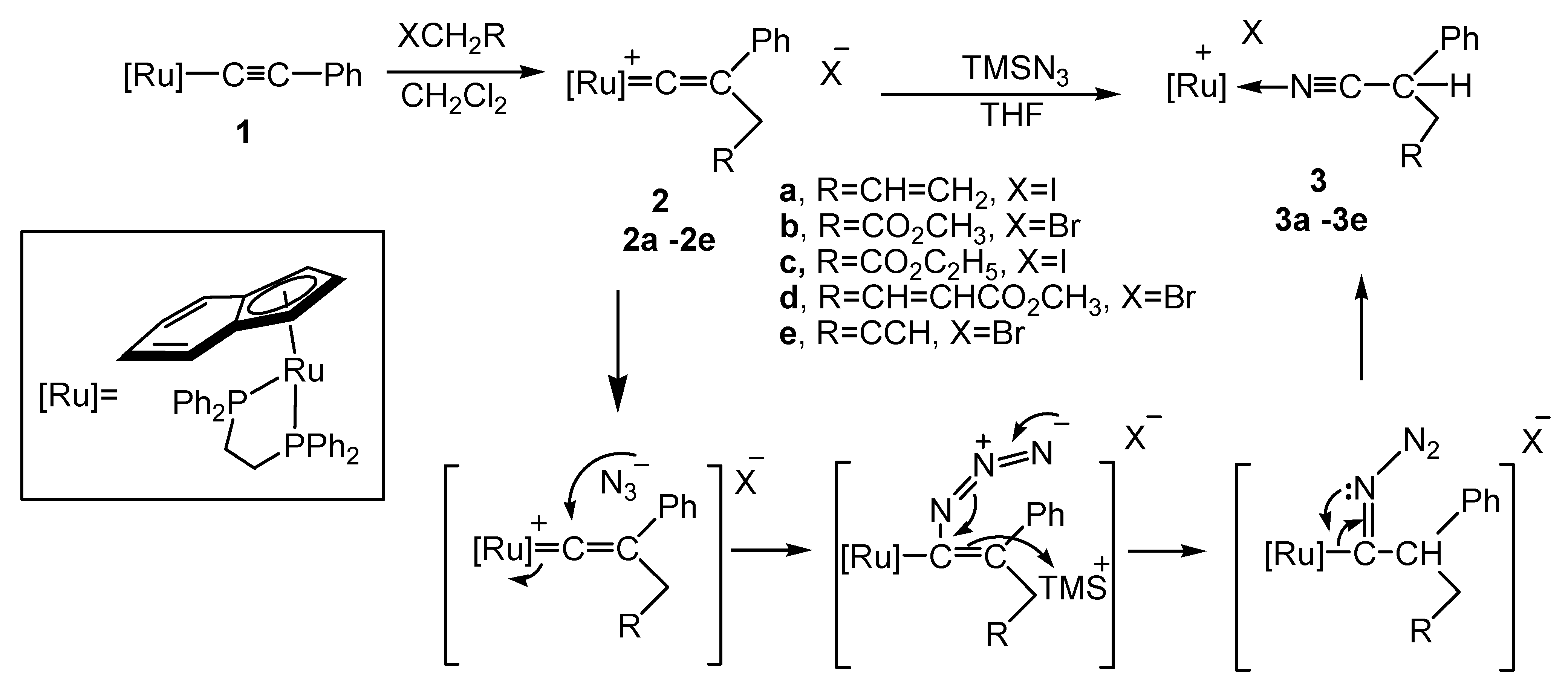 We reported the reactivity of cyclopropenylruthenium complexes containing indenyl and dppe ligands with TMSN3. Various substituents at the sp3 carbon of the three-membered ring govern the reactivity of the cyclopropenyl complexes with TMSN3. The reaction of ruthenium cyclopropenyl complexes containing indenyl and dppe ligands with TMSN3 may proceed via an electrophilic addition of the TMS group to the three-membered ring, followed by hydrolysis to afford vinylidene intermediates containing an azide counter anion [19]. Further nucleophilic additions of N3− at Cα, and an electrophilic addition of a second TMS group at Cβ followed by a loss of N2 leads to the N-coordinated nitrile complexes [56]. This process is similar to the chemistry of other cyclopropenylruthenium complexes. When a CN group was on the cyclopropenyl ring, a [3+2] cycloaddition of the nitrile group with azide afforded the tetrazolate complex [23]. Reactions of the cyclopropenyl complexes containing phenyl and its derivatives at Cγ yielded the stable N-coordinated complexes. In the Cp system, the reaction of cyclopropenyl complexes containing a methyl crotonate substituent or a vinyl substituent on the sp3 carbon of the cyclopropenyl ring with TMSN3 produced [Ru]–CN and the five-membered triazole ring. The ester group on the cyclopropenyl ring is the kinetic product, while a more stable five-membered furylruthenium product is likely the thermodynamic product. Reaction of the furylruthenium complexes with TMSN3 yielded [Ru]–N3 and the corresponding organic products by cleavage of the M–C bond. Unlike the published reactions of ruthenium cyclopropenyl complexes with TMSN3, which proceed through rupture of the three-membered-ring, the reaction of furylruthenium complexes with TMSN3 caused cleavage of the M–C bond [56]. However, those reports observed no reaction between ruthenium vinylidene complexes and TMSN3.