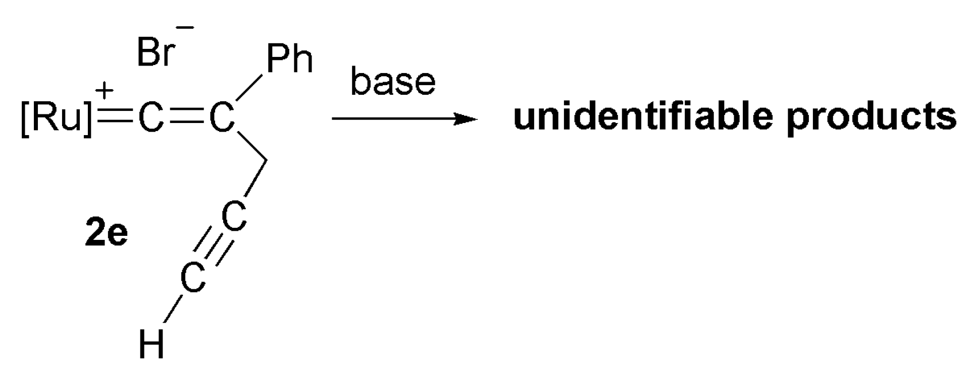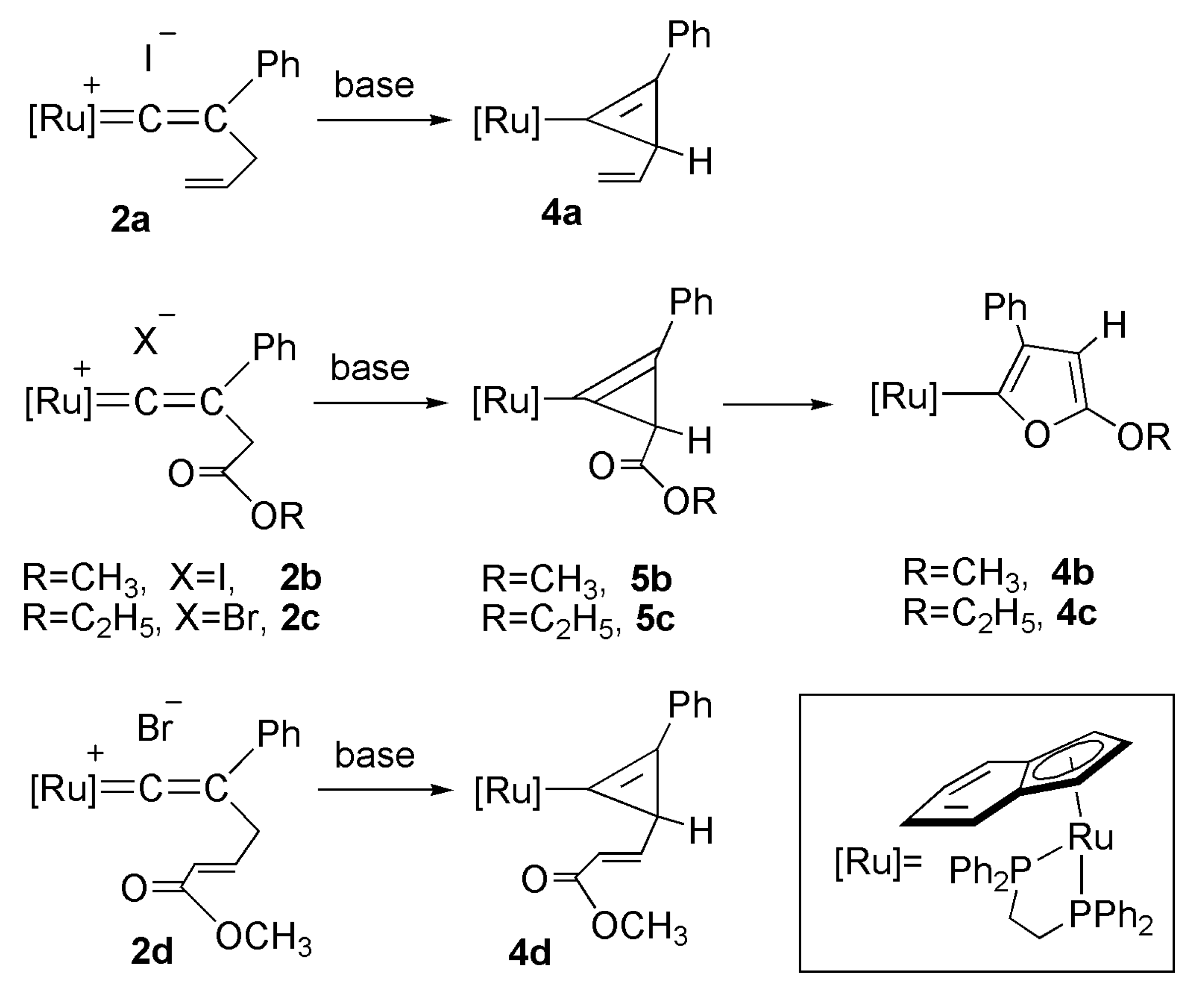 In the deprotonation reaction of the vinylidene complex containing a methyl crotonate substituent at Cγ, only the cyclopropenyl complex 4d was obtained as the stable product. However, deprotonation of the vinylidene complex 2e containing an alkynyl group at Cγ yielded several unidentifiable decomposition products, and no cyclopropenyl complex was observed (Scheme 3). Deprotonation of vinylidene complexes containing an ester group at Cγ produced furylruthenium complexes as thermodynamic products.