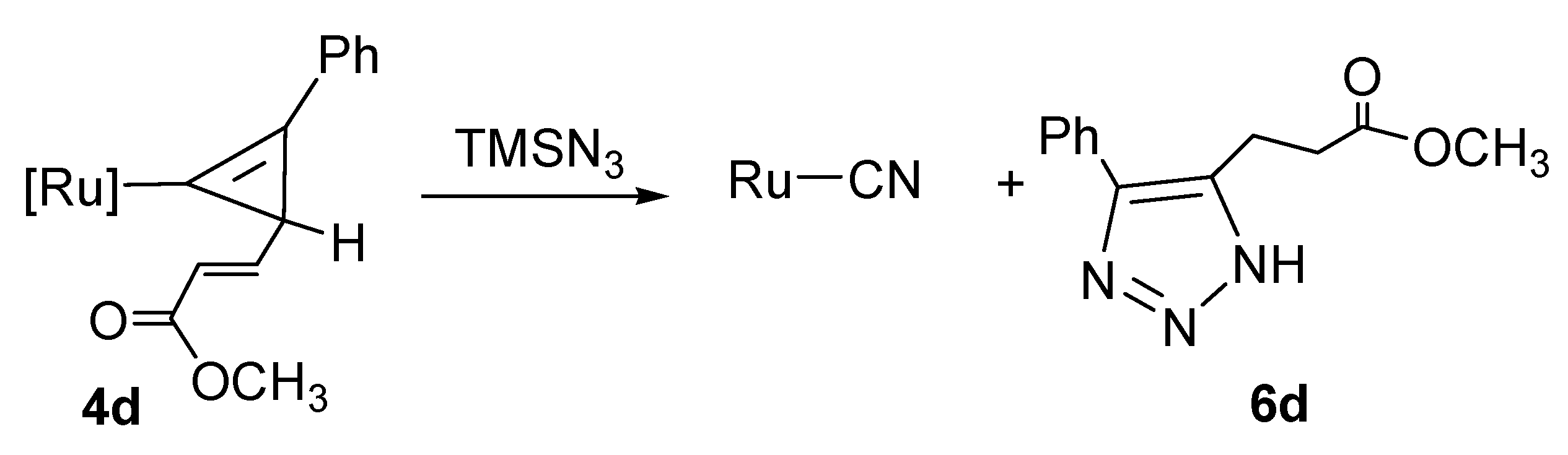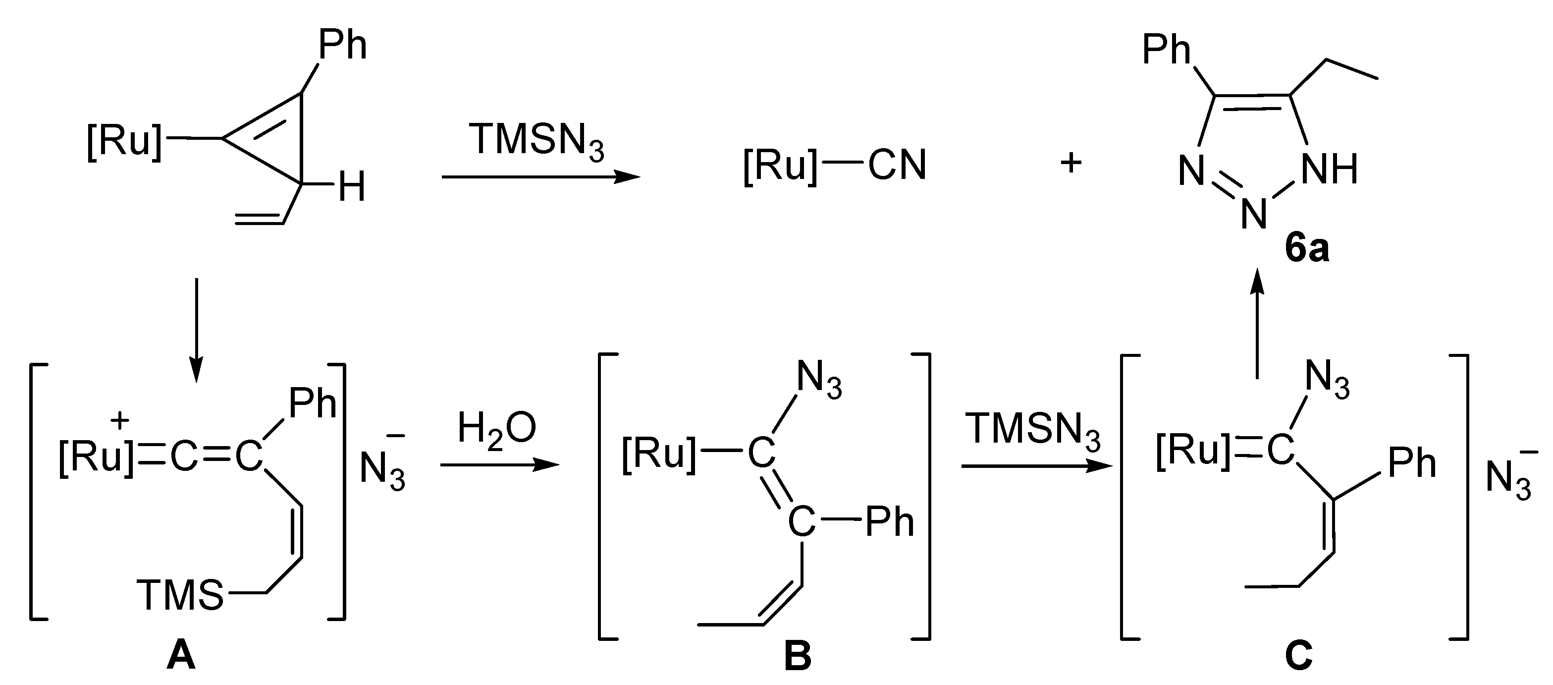 The organic product is 6a [56]. The reaction of 4a with TMSN3 results in cleavage of the C=C double bond of the cyclopropenyl ring yielding [Ru]–CN and 6a. Scheme 4 shows a possible reaction sequence. The reaction may start with an addition of a TMS group to the double bond of the allyl group. This accompanies the opening of the three-membered ring, resulting in the formation of a cationic vinylidene intermediate A. Subsequent nucleophilic addition of the azide anion at Cα, accompanied with the hydrolysis of the TMS group yielded B. Further addition of TMS group at Cδfollowed by hydrolysis of the TMS group yielded C. The single- bond character of the Cα–Cβ in B may facilitate its cleavage. Loss of N2 and a [3+2] cycloaddition of the Cβ–Cγ double bond with N3− produces the triazole 6a and [Ru]–CN.