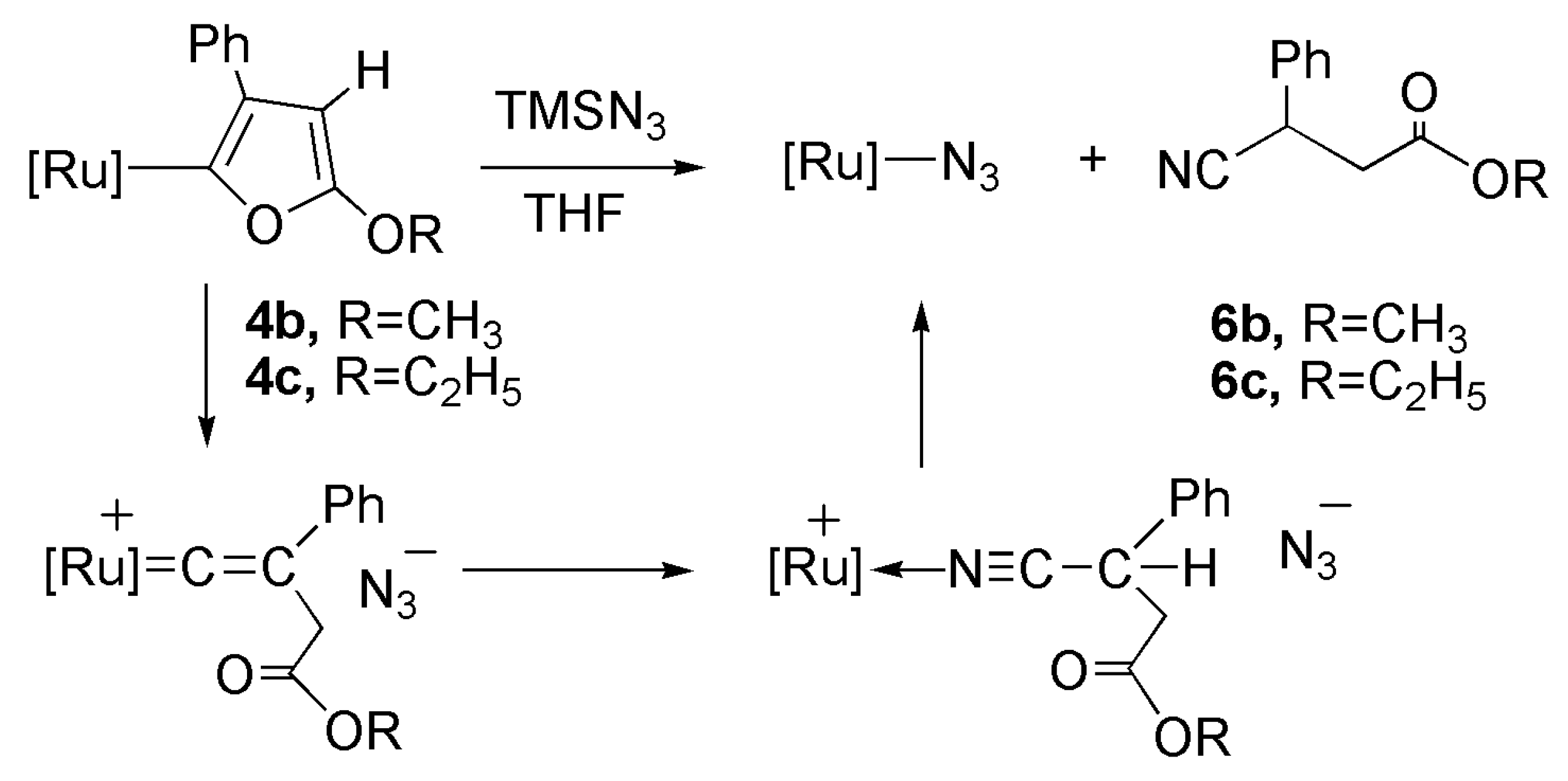 The X-ray diffraction analysis of the furylruthenium complex containing Cp and two PPh3 ligands has been reported [52]. The Ru-Cα bond length in the furylruthenium complex of 2.076(7) Å indicates a single bond. We have reported the X-ray diffraction analysis of the cyclopropenylruthenium complex containing indenyl and dppe ligands [19]. The Ru-Cα bond length in this complex is 2.028(2) Å, slightly shorter than other cyclopropenyl complexes [50,52]. This length might cause the ring-opening reaction when the cyclopropenyl or furylruthenium complexes to react with TMSN3. The reaction of 4b with TMSN3 leading to [Ru]–N3 and the corresponding organic product 6b may proceed via the similar pathway of synthesis complex 3b. Followed by the N3− attacks at Cα, the organic fragment can be obtained.