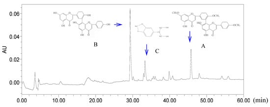 HPLC chromatogram of TFC (Major peaks were identified by comparison with standard compounds. A: sciadopitysin; B: amentoflavone; C: 2-(benzo[d][1,3]dioxol-5-yl)-propane-1,3-diol).