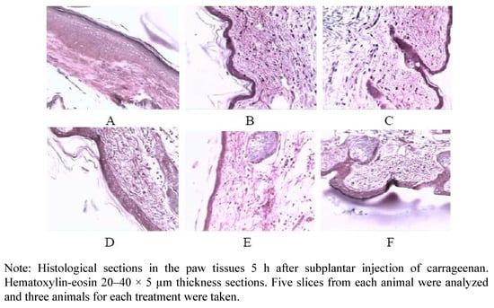 Histological assessment of sections from swollen feet of mice 5 h after carrageenan injection showed oedema and substantial infiltrates of acute inflammatory cells into the subplantar tissues, while the TFC administered group had lighter oedemas and fewer infiltrates of neutrophilic granulocyte (Figure 2).