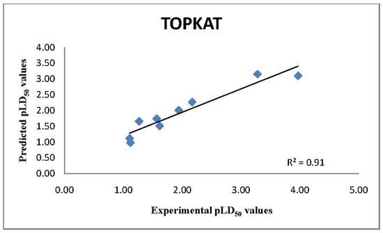 Comparison of Experimental pLD50 values with TOPKAT QSAR pLD50 model predictions.