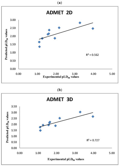 (a) Comparison of Experimental pLD50 values with 2D ADMET predictor QSAR pLD50 model predictions; (b) Comparison of Experimental pLD50 values with 3D ADMET predictor QSAR pLD50 model predictions.