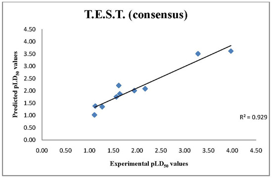 Comparison of Experimental pLD50 values with T.E.S.T QSAR pLD50 consensus model predictions.