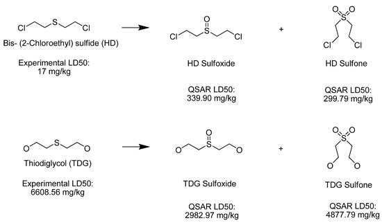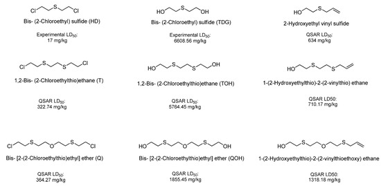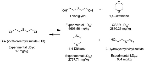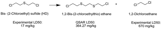 A total of 22 chemicals including the parent chemical HD, and its potential breakdown products, experimentally tested or untested, were evaluated using TOPKAT [37], ADMET Predictor [38], and T.E.S.T. [39] (Table 1). Experimental rat oral LD50 data for this study was available from two sources, ChemIDplus and Registry of Toxic Effects of Chemical Substances databases.