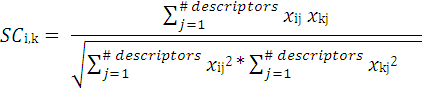 where xij is the value of the j-th normalized descriptor for chemical i (normalized with respect to all of the chemicals in the original training set) and xkj is the value of the j-th descriptor for chemical k. The entire pool of approximately 800 descriptors is used to calculate the similarity coefficient in equation 2. A multiple linear regression model is then built for the new cluster using a genetic algorithm-based method, and the toxicity is predicted [30].