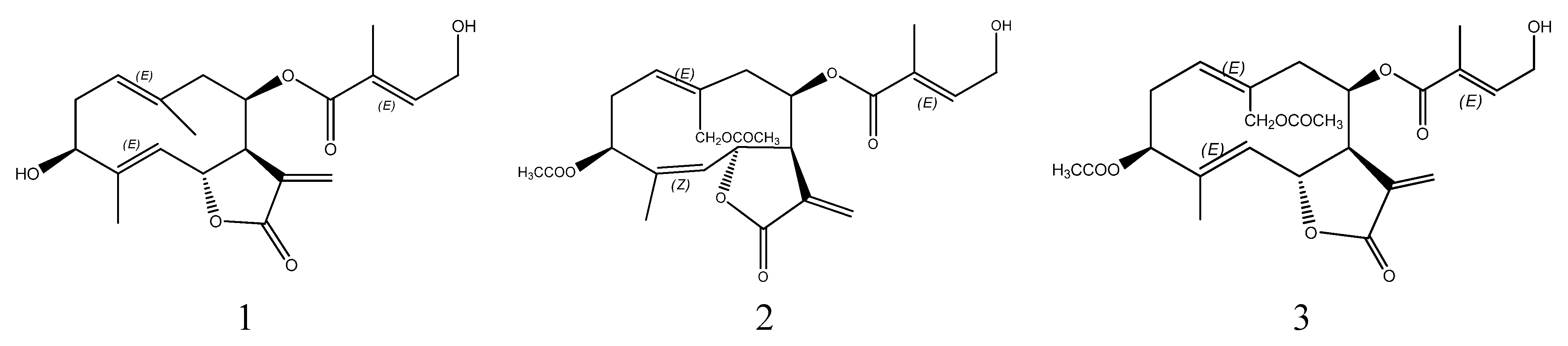 Chemical structures of three sesquiterpenoid lactones from Eupatorium lindleyanum DC. (1: 3β-Hydroxy-8β-[4′-hydroxytigloyloxy]-costunolide; 2: eupalinolide A; 3: eupalinolide B)