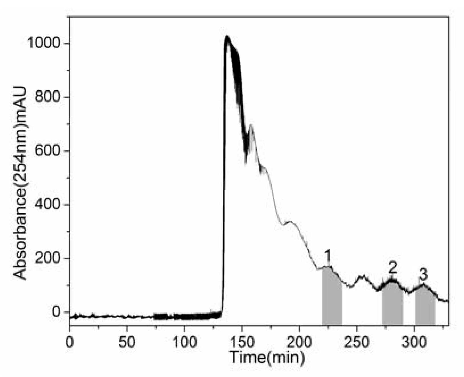 HSCCC separation chromatogram of n-butanol fraction of the Eupatorium lindleyanum DC. ethanol extract. Solvent system: n-hexane-ethyl acetate-methanol-water (1:4:2:3, v/v/v/v); flow rate: 2.0 mL/min; revolution speed: 900 rpm; detection wavelength: 254 nm; column temperature: 25 °C; sample: 540 mg of n-butanol fraction dissolved in 10 mL two-phase solvent system. Peaks 1, 2 and 3 correspond to 3β-hydroxy-8β-[4'-hydroxytigloyloxy]-costunolide, eupalinolide A and eupalinolide B, respectively.