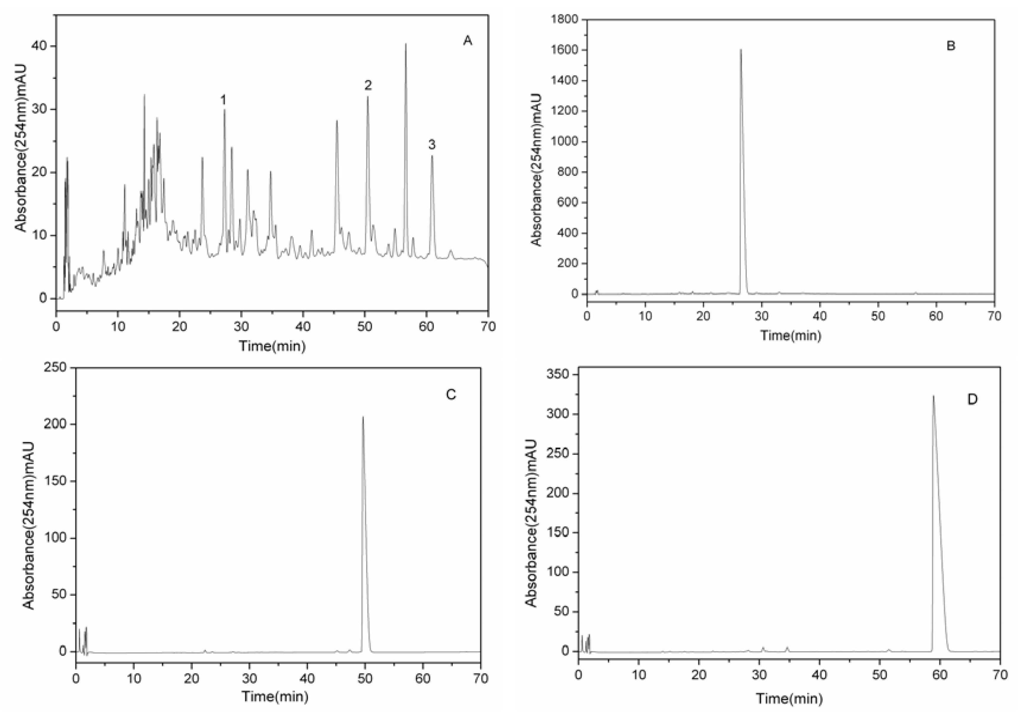 The separation time was about 330 min in each separation run. Figure 2 showed that the three compounds were eluted in order of increasing K value and good resolution could be obtained. HSCCC is based on the principle of the partition coefficient of the solutes between the stationary and mobile phases [10], so the solutes were eluted from the multilayer coil separation columns in order of their partition coefficient. Finally three fractions were collected, the fraction from peak 1 of this separation yielded 10.8 mg of compound 1, the fraction from peak 2 yielded 17.9 mg of compound 2, and the fraction from peak 3 yielded 19.3 mg of compound 3. The purities of compounds 1–3 were 91.8%, 97.9% and 97.1%, respectively, as determined by HPLC (Figure 3B–D).