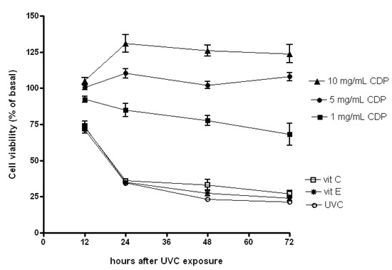 Exposure to UVC is known to induce cell apoptosis [7,28]. Our data showed that the fibroblasts retained about 75% cell viability compared to non UV-treated cells (referred to as basal) 12 h after UV exposure for UVC, vitamin E and C treated groups. Further the UVC irradiation induced more than 70% cell death in skin fibroblasts 24 h after the exposure (Figure 1). A large decrease in cell viability was also observed in those treated with vitamin E or C after the UV irradiation. However, fibroblasts treated with 1 mg/mL of CDP remained 90% in cell viability 12 h post the UV irradiation and only slightly reduced further at 24, 48 and 72 h. Interestingly, a treatment with CDP (5 and 10 mg/mL) showed 100% protection against UVC-induced cytotoxicity throughout the entire experimental period.