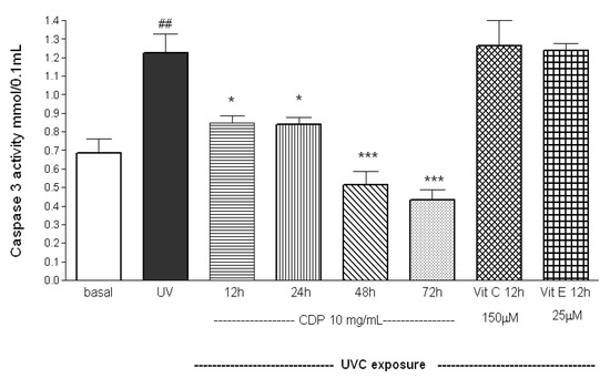 Inhibitory effects of CDP on UVC-induced caspase-3 activity. Skin fibroblasts were treated with CDP (10 mg/mL), vitamin C (150 μM), or vitamin E (25 μM) after UVC exposure with a total dose of 15 J/cm2 at 12, 24, 48, and 72 h prior to caspase-3 activity assay. Statistics are shown for UVC treated group, ## p < 0.01 compared to basal group, * p < 0.05 compared to UVC group at 12 and 24 h after the UV exposure, *** p < 0.005 compared to UVC group 48 and 72 h after the UV exposure.