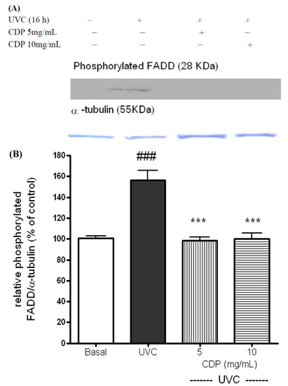 Effects of CDP on UVC-induced phosphorylated FADD protein expression (A). Skin fibroblasts were treated with CDP 5 and 10 mg/mL after UVC exposure with a total dose of 15 J/cm2 and cells were cultured at 16 h prior to harvesting for protein extraction. Statistics of relative density (B) are shown for UVC treated group, ### p < 0.005 compared to basal group, *** p < 0.005 compared to the CDP 5mg/mL and 10 mg/mL-treated groups.