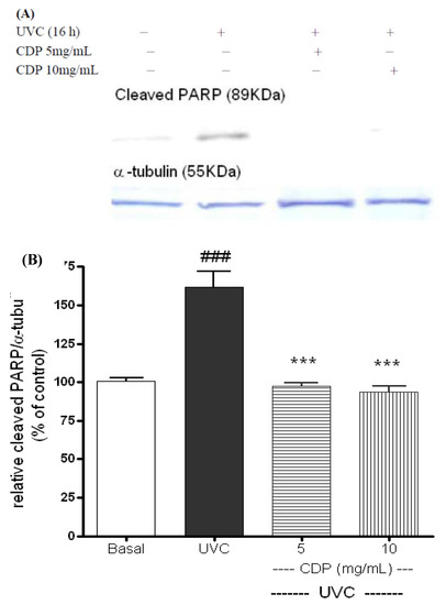 Inhibitory effects of CDP on UVC-induced cleaved PARP-1 protein expression (A). Skin fibroblasts were treated with CDP 5 and 10 mg/mL after UVC exposure with a total dose of 15 J/cm2 and cells were cultured at 16 h prior to harvesting for protein extraction. Statistics of relative density (B) are shown for UVC treated group, ### p < 0.005 compared to basal group, *** p < 0.005 compared to the CDP 5mg/mL and 10 mg/mL-treated groups.