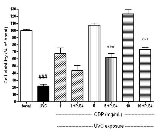 Counteractive effects of PJ34 on protective effects of CDP against to UVC-induced cytotoxicity. Skin fibroblasts were treated with CDP (1, 5 or 10 mg/mL) and PJ34 (20 μM) after UVC exposure with a total dose of 15 J/cm2 at 72 h prior to cell viability assay. Statistics are shown for UVC treated group ### p < 0.005 compared to the basal and 5 +PJ34 and 10 +PJ34 *** p < 0.005 compared to the CDP 5 mg/mL and 10 mg/mL-treated groups, respectively.