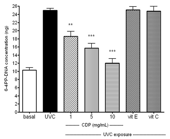 Inhibitory effects of CDP on UVC-induced DNA damage. Skin fibroblasts were treated with CDP (1, 5 or 10 mg/mL), vitamin C (150 μM), or vitamin E (25 μM) after UVC exposure with a total dose of 15 J/cm2 at 24 h prior to 6-4PP DNA concentration assay. Statistics are shown for 1 mg/mL CDP ** p < 0.01; 5 and 10 mg/mL *** p < 0.005 compared to the UVC treated group.