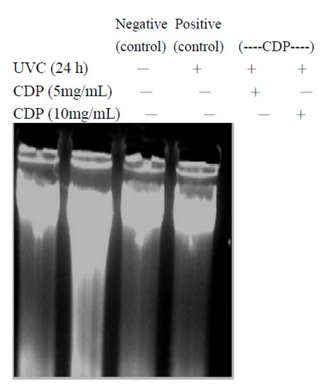 To elucidate whether UVC exposure induced DNA damage in the skin fibroblasts can be prevented by CDP, a pyrimidine (6-4) pyrimidone photoproducts (6-4PP) assay and a DNA laddering assay were performed. Results showed that the CDP-treated fibroblasts had much lower 6-4PP-DNA concentration in a dose-dependant manner (p < 0.01 for 1 mg/mL and p < 0.005 for 5 and 10 mg/mL of CDP, Figure 6) which means a lower extent of DNA damage upon UVC irradiation and CDP exerts a protective effect.
