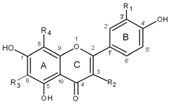 Buckwheat is considered to be a major dietary source of rutin (quercetin 3-rutinoside), however, other flavonoids such as quercetin, myricetin, hyperoside (quercetin 3-O-β-D-galactoside), quercitrin (quercetin 3-O-α-L-rhamnoside), epicatechin and flavone C-glucosides were also identified in buckwheat during the last decade [2,3,18]. The main flavone C-glucosides present in buckwheat seeds include orientin and homoorientin, a pair of isomeric compounds, and their 4'-deoxy analogues, namely vitexin and isovitexin [19]. The chemical structure of the major buckwheat flavonoids is shown on Figure 1.