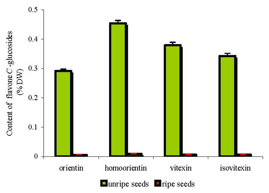In this study, flavone C-glucosides, namely orientin, homoorientin, vitexin and isovitexin, were only found in unripe and ripe seeds collected from common buckwheat at 48 and 100 DAS, respectively (Figure 2).