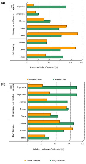In this study we showed the highest rutin contents in flowers (7.2–7.7% DW) and leaves (5.1–8.2% DW) collected from common and tartary buckwheat at the early flowering as well as flowering and seed formation states. Low quercetin contents within the range of 0.01–0.25% DW were found in all studied aerial parts of buckwheat plants. Quercitrin was only found in flowers collected from common buckwheat plant at the early flowering state (0.54 ± 0.03% DW) and at flowering and seed formation state (1.80 ± 0.10% DW) while flavone C-glucosides were accumulated preferentially only in unripe seeds collected from common buckwheat at early flowering state. The order of AC values at early flowering state was as follows: flowers > leaves > stems while at flowering and seed formation state: flowers > leaves > unripe seeds > stems. The positive correlation between results obtained by DPPH and PCL assays indicates that both methods may serve as a useful tool for selection of the aerial part of buckwheat with the highest antioxidant capacity. The highest contribution of rutin to AC of the aerial parts of common and tartary buckwheat was found for stems followed by leaves, flowers and unripe seeds. These results indicate that, in term of rutin content and its contribution to AC, flowers collected from common and tartary buckwheat at early flowering as well as flowering and seed formation states have the future potential to be a useful food ingredient.